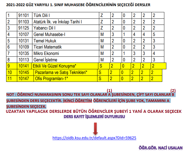 14.09.2021 - 2021-2022 Güz Yarıyılı 1.Sınıf Muhasebe ve Vergi Bölümü Öğrencilerinin Seçeceği Dersler Hk.