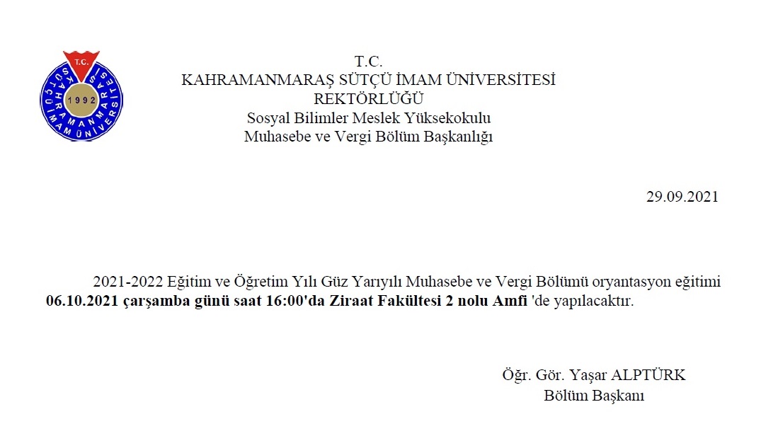 29.09.2021 - Bölüm öğrencilerimizin dikkatine (Oryantasyon Eğitimi Hakkında)